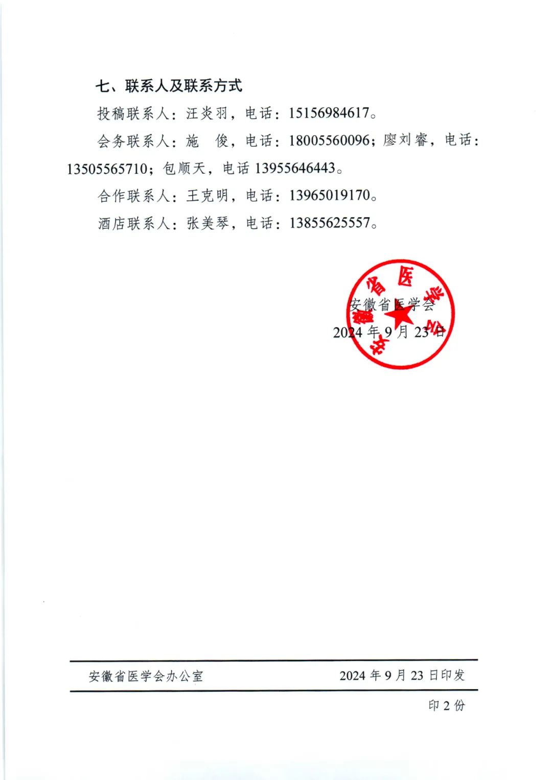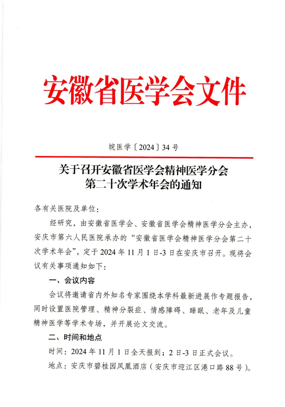 会议预告| 安徽省医学会精神医学分会第二十次学术年会各有关医院及单位: 经研究,由安徽省医学会、安徽省医学会精神医学分会主办,安庆市第六人民医院承办的“安徽省医学会精神医学分会第二十次学术年会”,定于2024年11月1日-3日在安庆市召开。 一、会议内容 会议将邀请省内外知名专家围绕本学科最新进展作专题报告,同时设置医院管理、精神分裂症、情感障碍、睡眠、老年及儿童精神医学等学术专场,并开展论文交流。 二、时间和地点 时间:2024年11月1日全天报到; 11月2日-11月3日正式会议。 地点:安庆市碧桂园凤凰酒店(安庆市迎江区港口路 88号)。